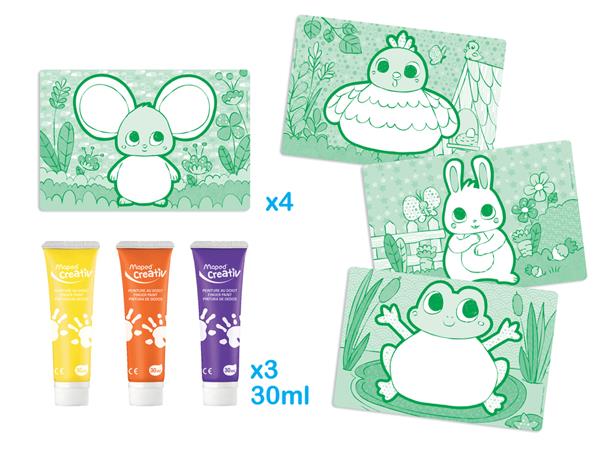 Légy kreatív: a tökéletes ujjfestő készlettel! 2 éves kortól ajánlott összehajtható lapok farm témájú illusztrációk béka, nyúl, csirke és egér ábrák a doboz tartalma: 4 db foglalkoztató lap 3 x 30 ml-es ujjfesték (narancssárga, lila, sárga)
