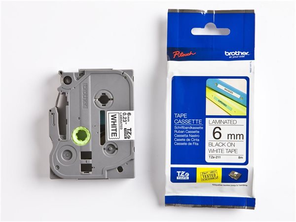 Feliratozógép szalag, 6 mm x 8 m, BROTHER, "TZe-211" fehér-fekete