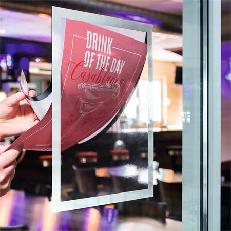 DURAFRAME® SUN, elektrosztatikusan tapadó infokeret adhézió segítségével, könnyedén, buborékmentesen rögzíthető az üvegfelülethez.